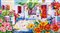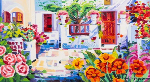 Athos Faccincani Peschiera del Garda (Vr) 1951 Interno con fiori e luce a Santorini 2012, Olio su tela cm. 40x70 Firmato in basso a destra; Autentica dell'Artista su foto.