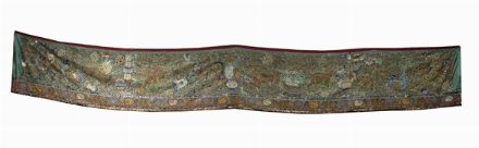 Grande arazzo ricamato, raffigurante animali mitologici alternati con fiori e vasi in stile Pe-Ku, con applicazioni di piccoli specchi, perline e pietre, Cina, metà XIX sec., cm. 400x60.