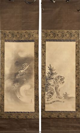 Naunobu Kanò (Kyoto, 1607 - Kyoto, 1650) TIGRE E DRAGONE (dittico) Acquarello su carta, cm. 178x53 (ciascuno). Firma in basso a sinistra. Custoditi in una scatola di legno con iscrizione, cm. 13,5x61x8