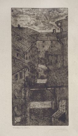 Giovanni Bartolena (Livorno, 1866 - 1942) SCORCIO DI PAESE Acquaforte, mm. 270x425 (foglio);mm. 295x142 (lastra) Firma in basso a destra. In basso a sinistra a matita: esemplare n° 49 “Paese”.