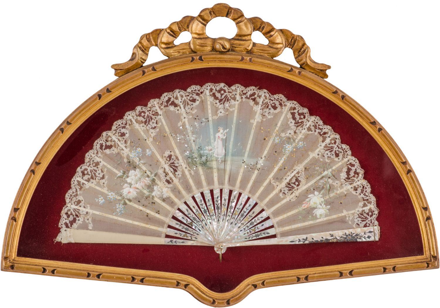 VENTAGLIO con stecche in madreperla con pagina in seta e merletto dipinto a mano entro ventagliera. Sicilia primi '900 Misure: cm 45 x 63