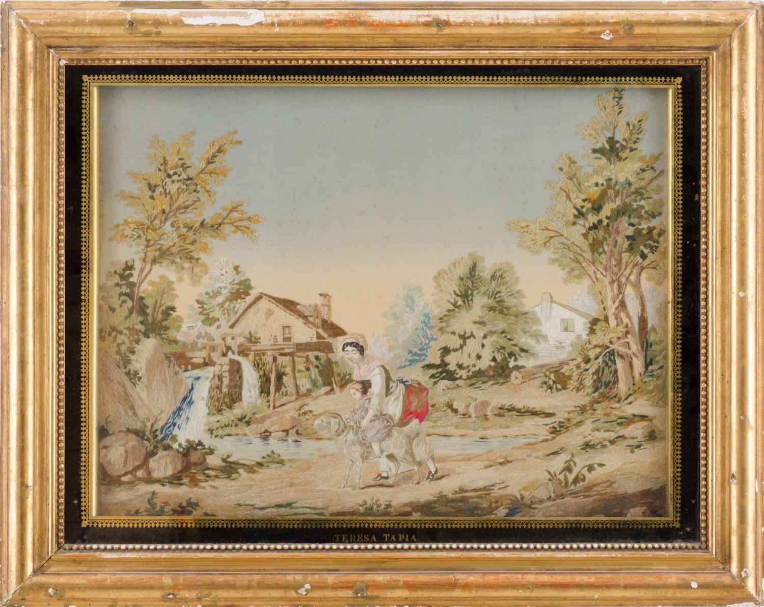 ARAZZO "paesaggio con caseggiato e personaggi" entro cornice in legno dorato ad oro zecchino. Spagna XIX secolo Misure: cm 53 x 69