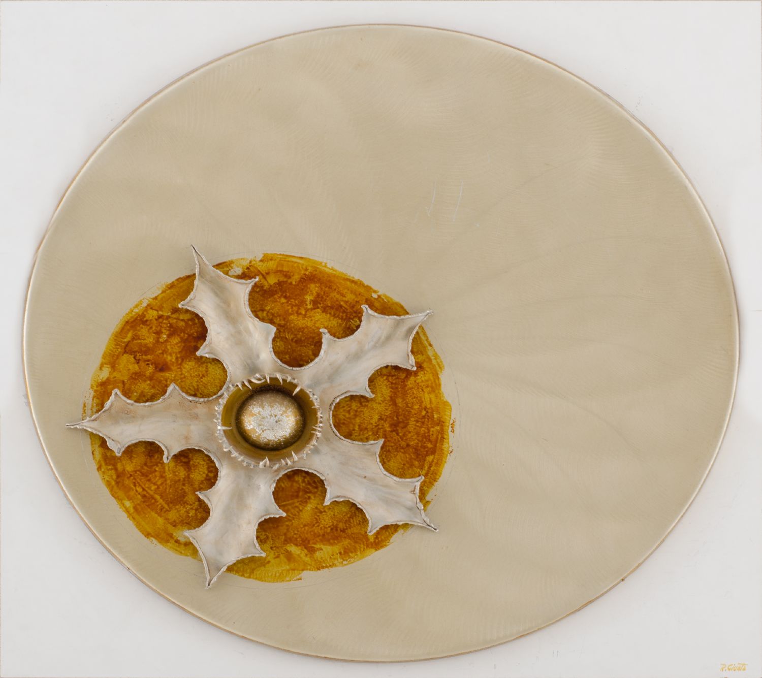 ALTORILIEVO circolare in lamiera dorata e dipinta su supporto in legno. XX...