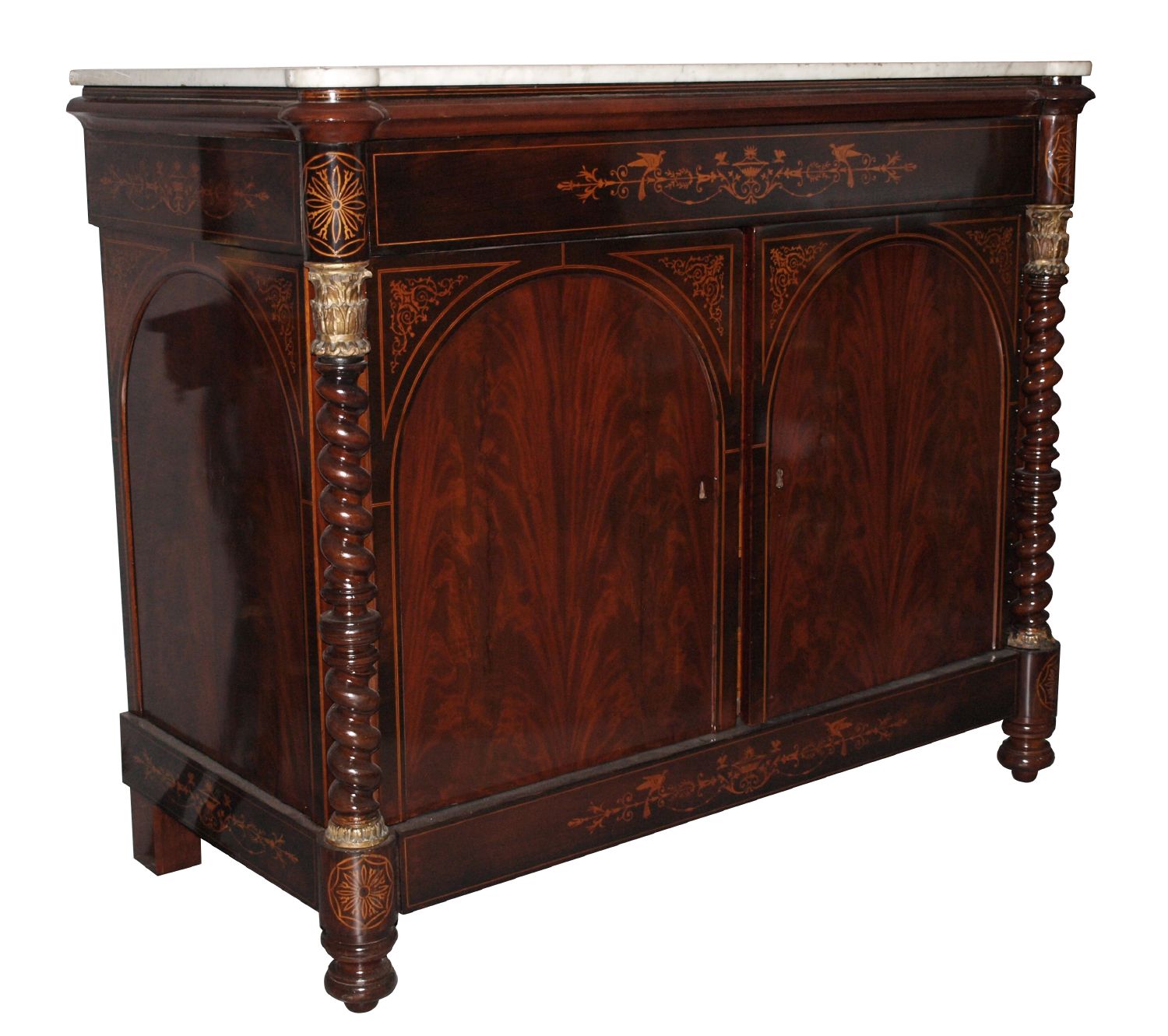 CAMICIERA Isabellina in mogano e piuma di mogano con tarsie in bosso, struttura interna in acero filettato, piano in marmo bianco. Spagna XIX secolo Misure: cm 128 x 63 x h 107