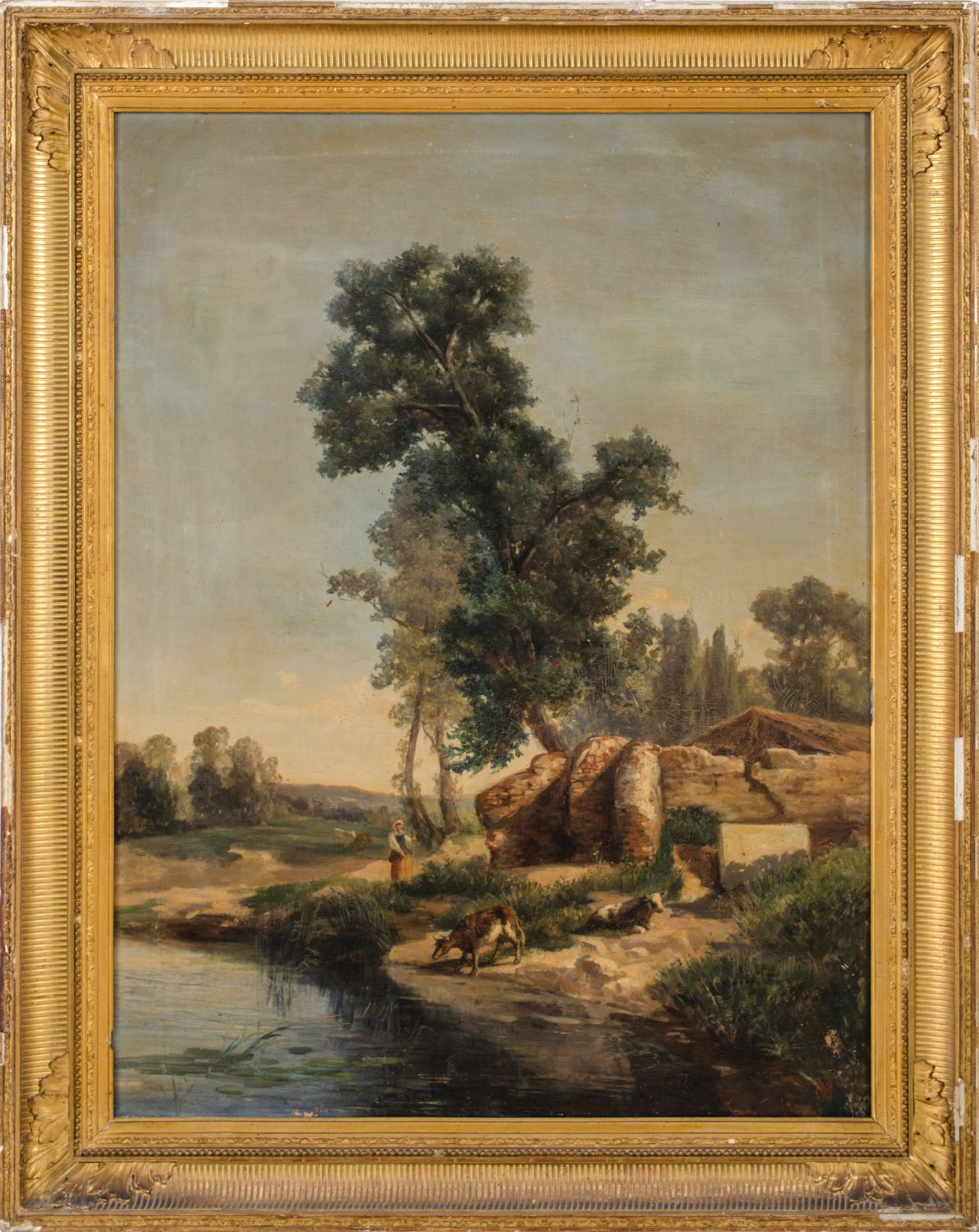 OLIO su tela "paesaggio con lago" entro cornice in legno dorato ad oro zecchino. Francia XIX secolo Misure: cm 102 x 77