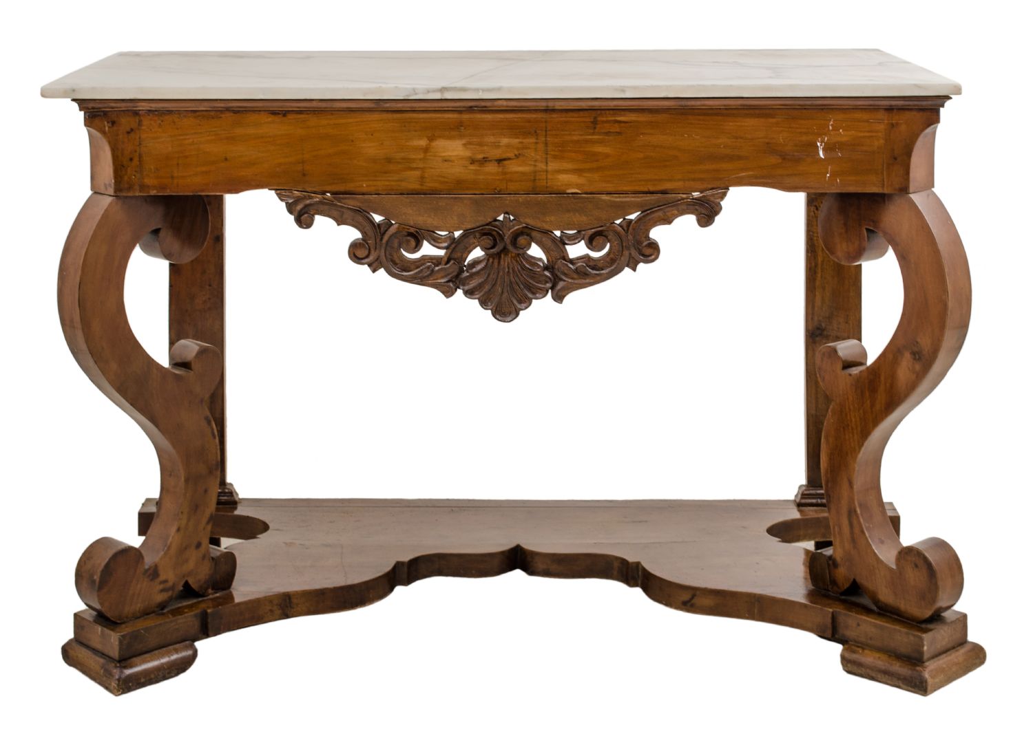 CONSOLE Luigi Filippo in noce con piedi a sciabola, piano in marmo bianco. Sicilia meta' '800 Misure: cm 136 x 76 x h 92