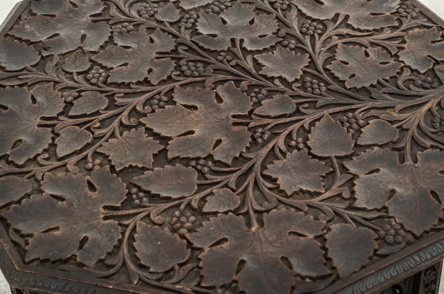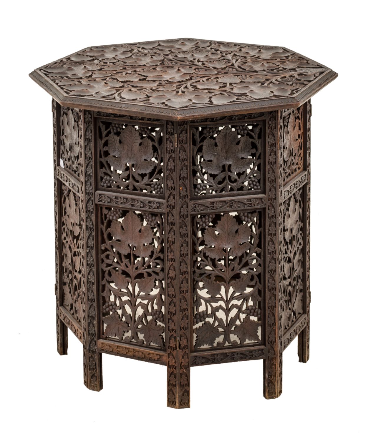 TAVOLINO ottagonale orientale in noce riccamente intagliato. XX secolo...