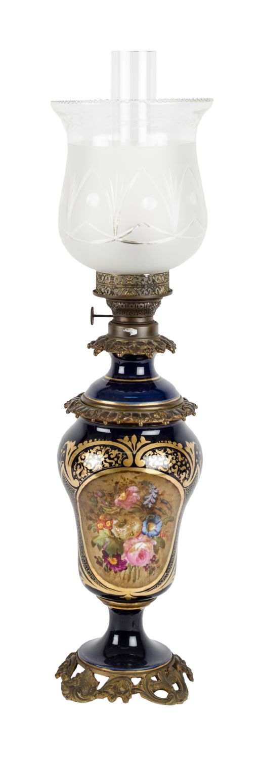 LUME a petrolio in porcellana dipinta e decorata in oro con base e parte superiore in bronzo. Francia XIX secolo Misure: h cm 74
