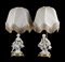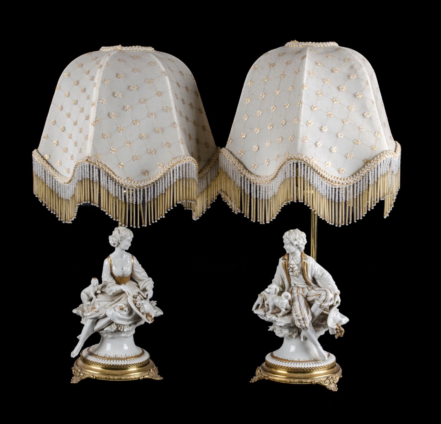 COPPIA LUMI in ottone con sculture in porcellana raffiguranti "giovani...