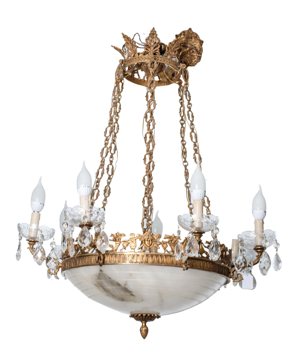LAMPADARIO stile Impero a sette fiamme in bronzo dorato con coppa in alabastro. Sicilia I meta '900 Misure: h cm 85