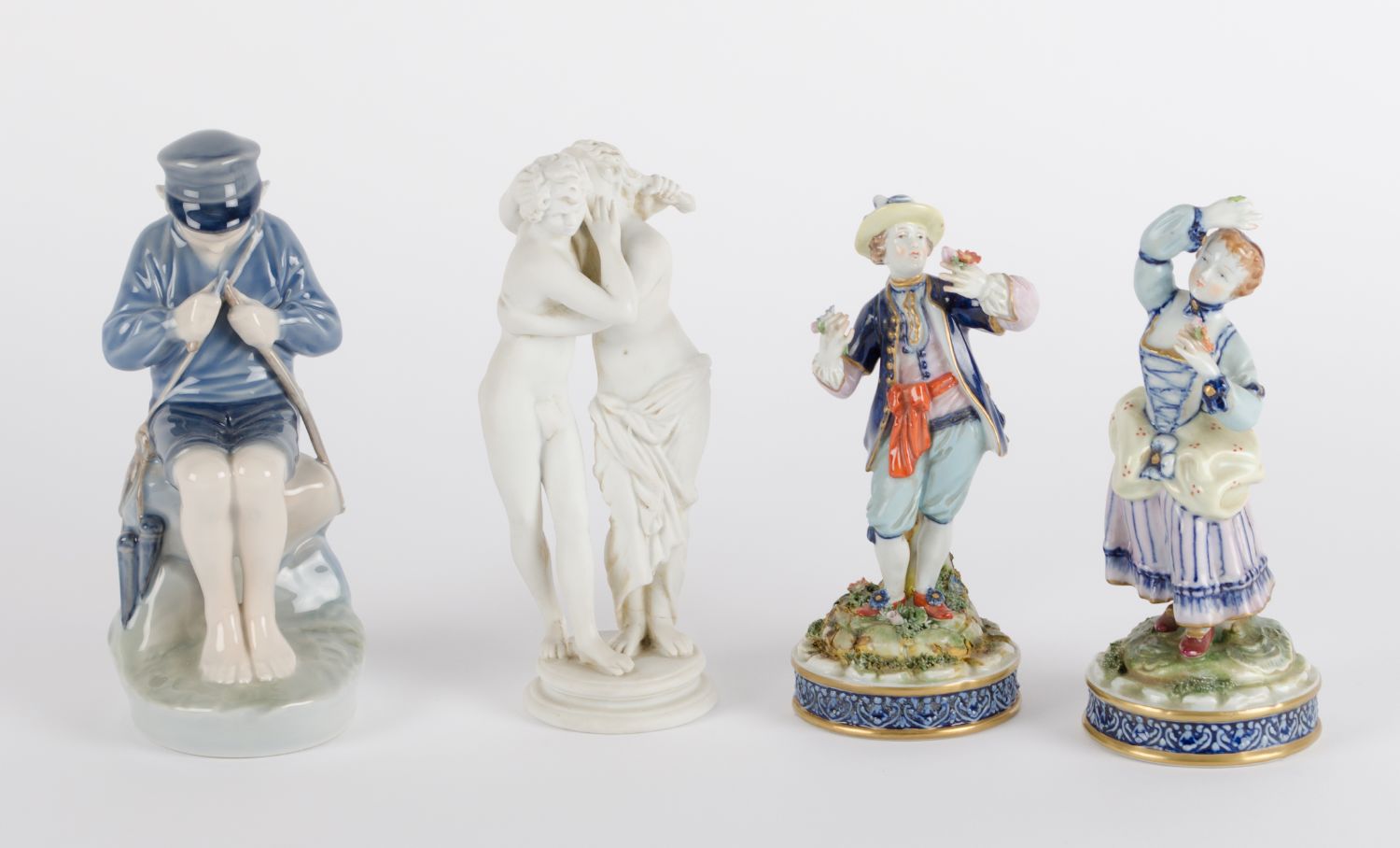 LOTTO composto da coppia SCULTURE in porcellana Capodimonte raffigurante "personaggi" , SCULTURA in porcellana Copenaghen raffigurante "figura maschile" e da SCULTURA in biscuit raffigurante "personaggi". XX secolo Misure: varie