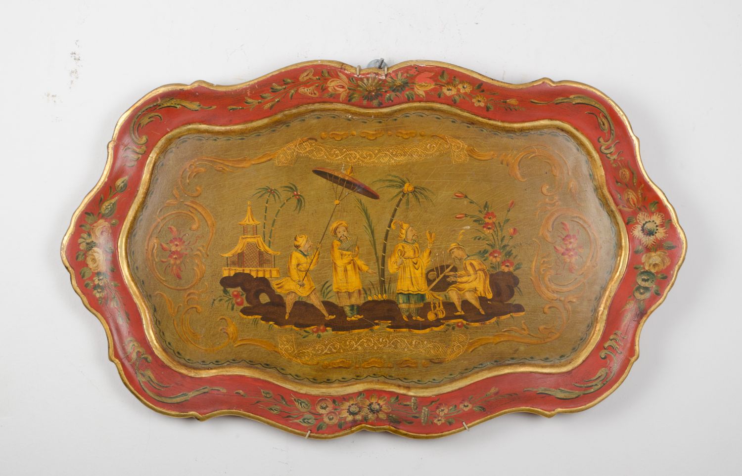 GUANTIERA in legno dipinto e laccato raffigurante "scena di vita orientale". XX secolo Misure: cm 70 x 42