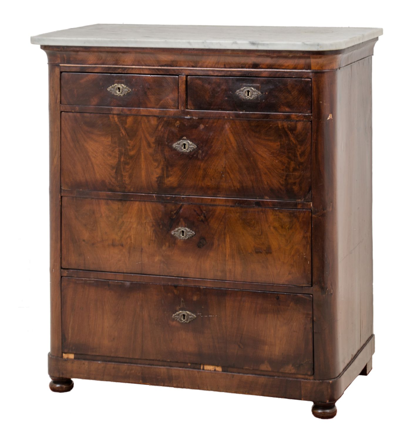 CASSETTONCINO in mogano e piuma di mogano con tre cassetti e due cassettini, piano in marmo bianco di Carrara. Sicilia XIX secolo Misure: cm 86 x 45 x h 94