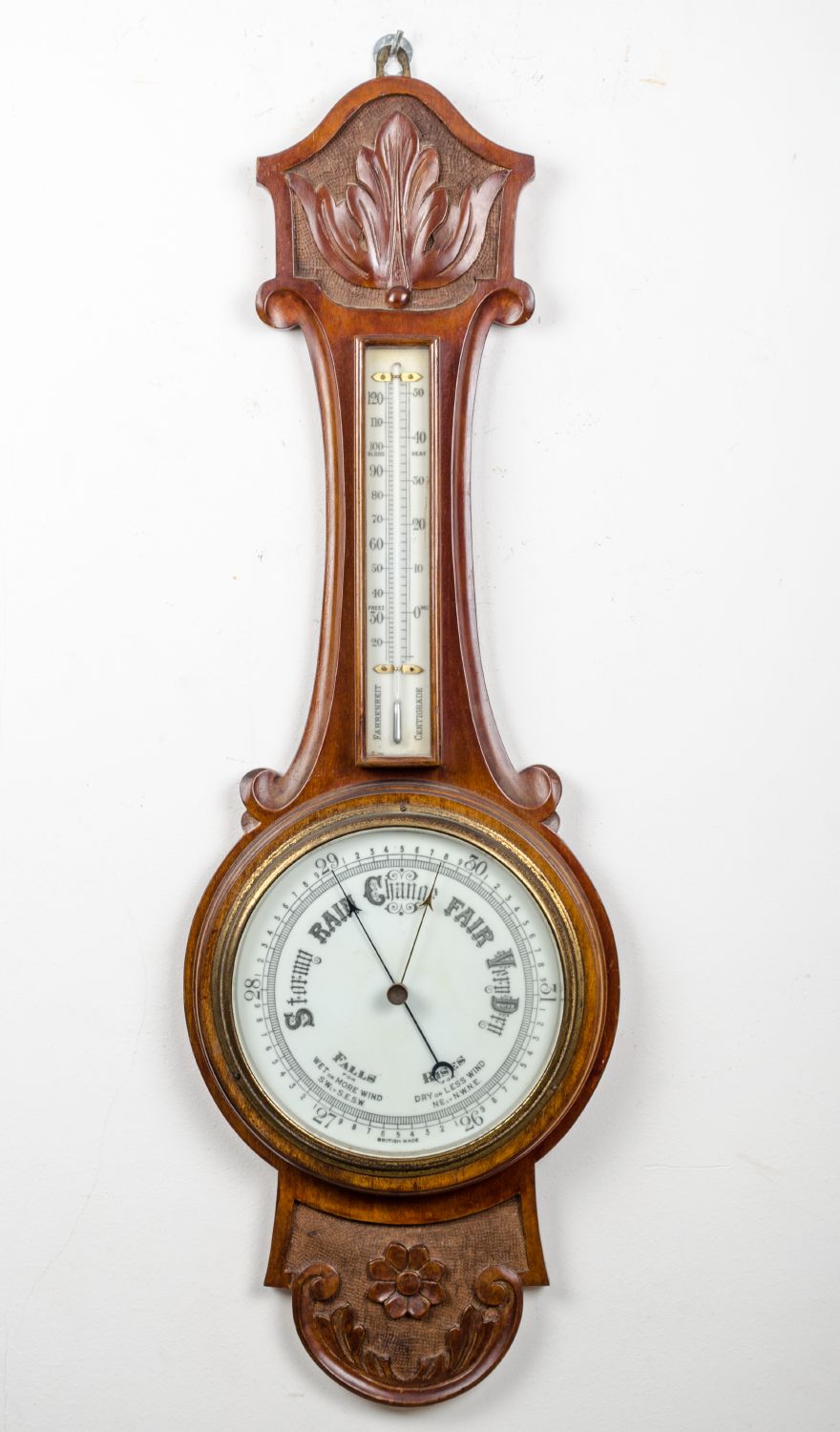 BAROMETRO in mogano con cartolina pubblicitaria. Inghilterra primi '900 Misure: h cm 82