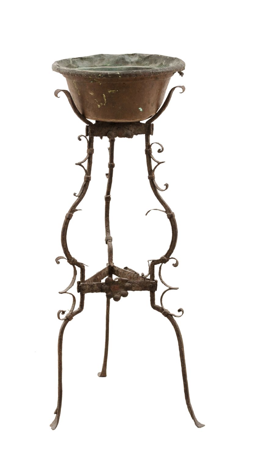 BASE tripode in ferro con PORTAVASO in rame. XIX secolo Misure: diametro cm 28 x h 77