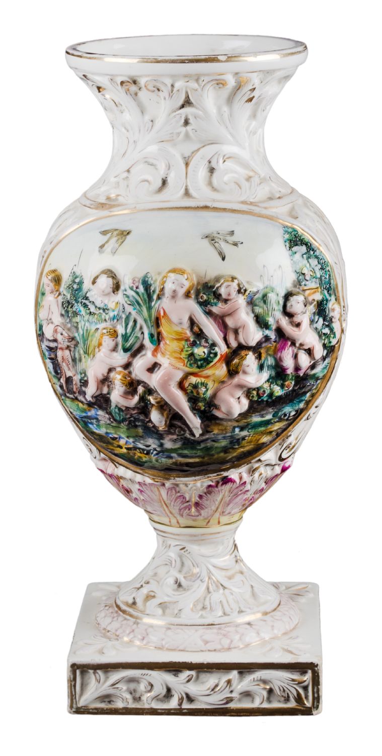 VASO in porcellana Capodimonte decorato con putti a rilievo (difetti). Italia...