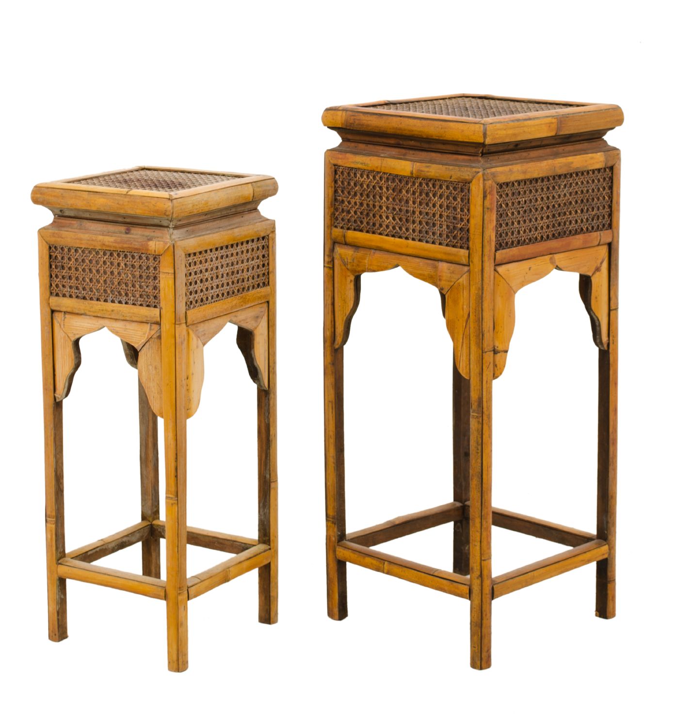 DUE CANTONI in legno di bambu' e finocchino. XX secolo Misure: cm 31 x 31 x h 79