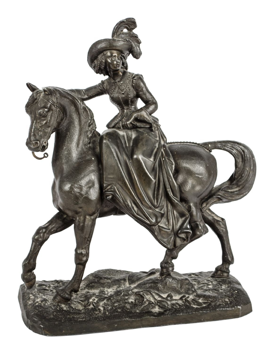 SCULTURA in antimonio "gentildonna con cavallo". XX secolo Misure: cm 24 x...