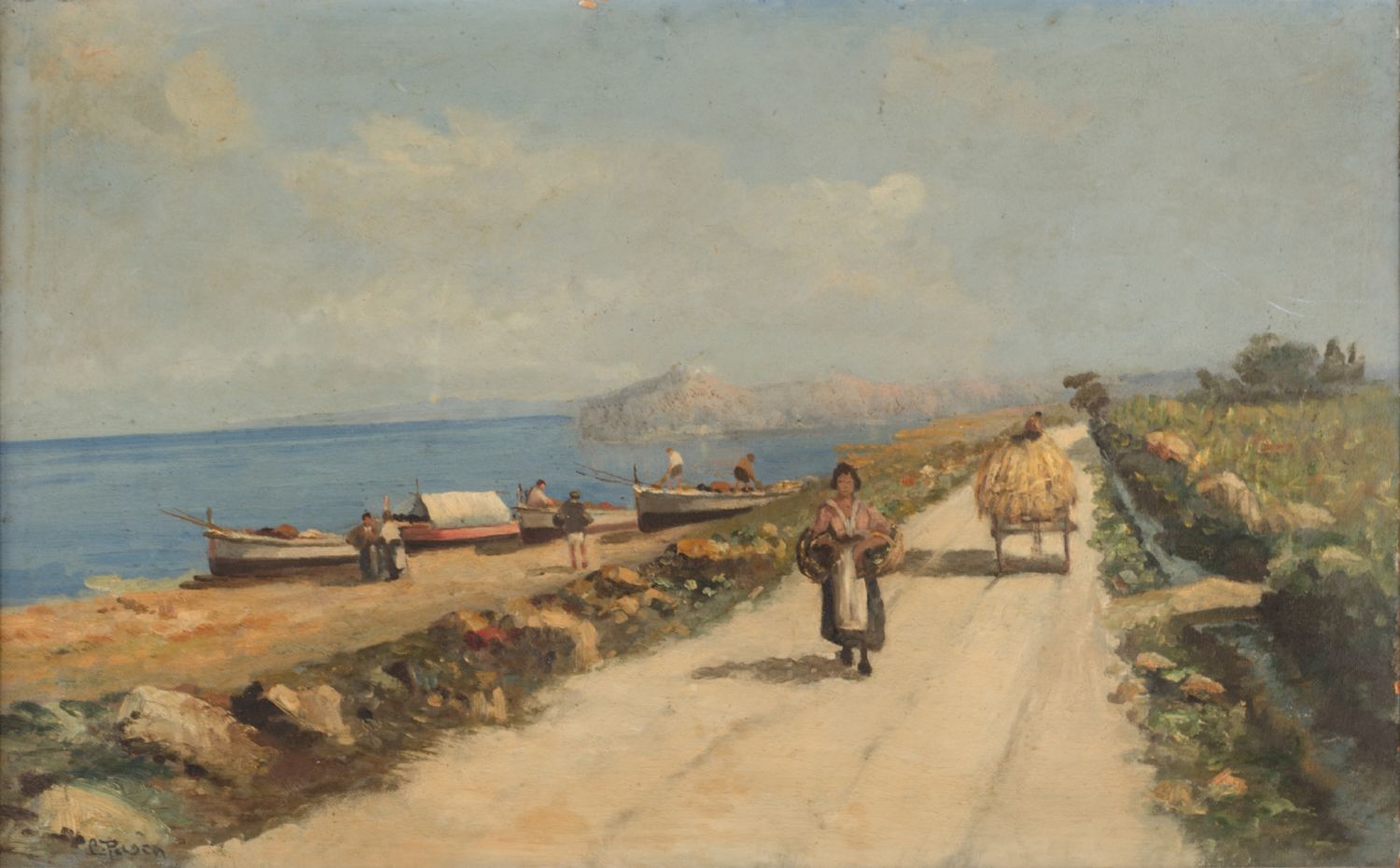 Lot 270 | PILOCA OLIO su masonite "costa siciliana con pescatori e barche". Primi '900...