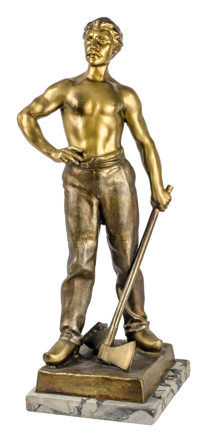SCULTURA in antimonio "il lavoro", base in marmo venato. XX secolo Misure: h cm 68