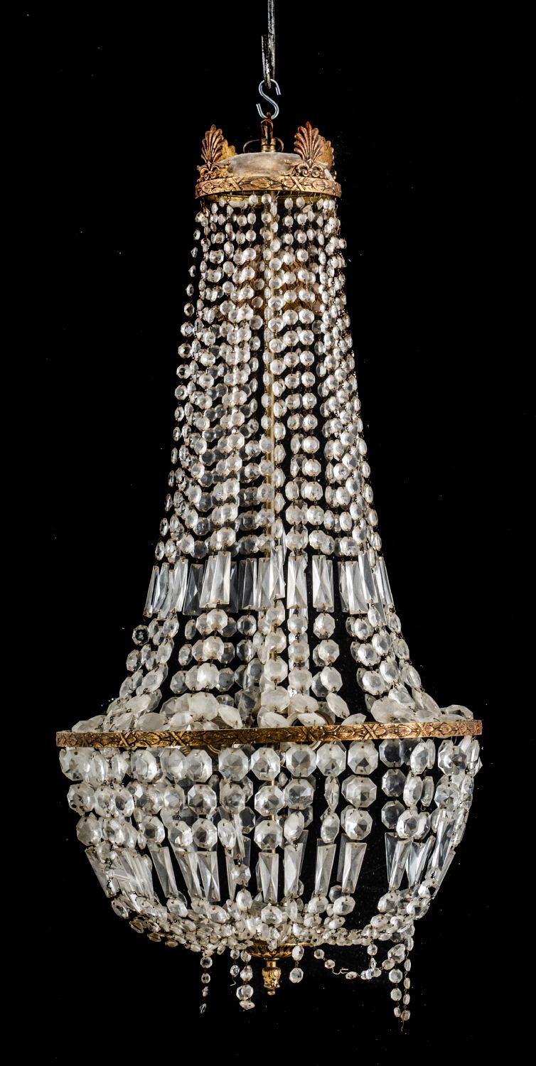 Lot 278 | LAMPADARIO a ninfa a tre luci in metallo dorato con brindoli. Sicilia XX...