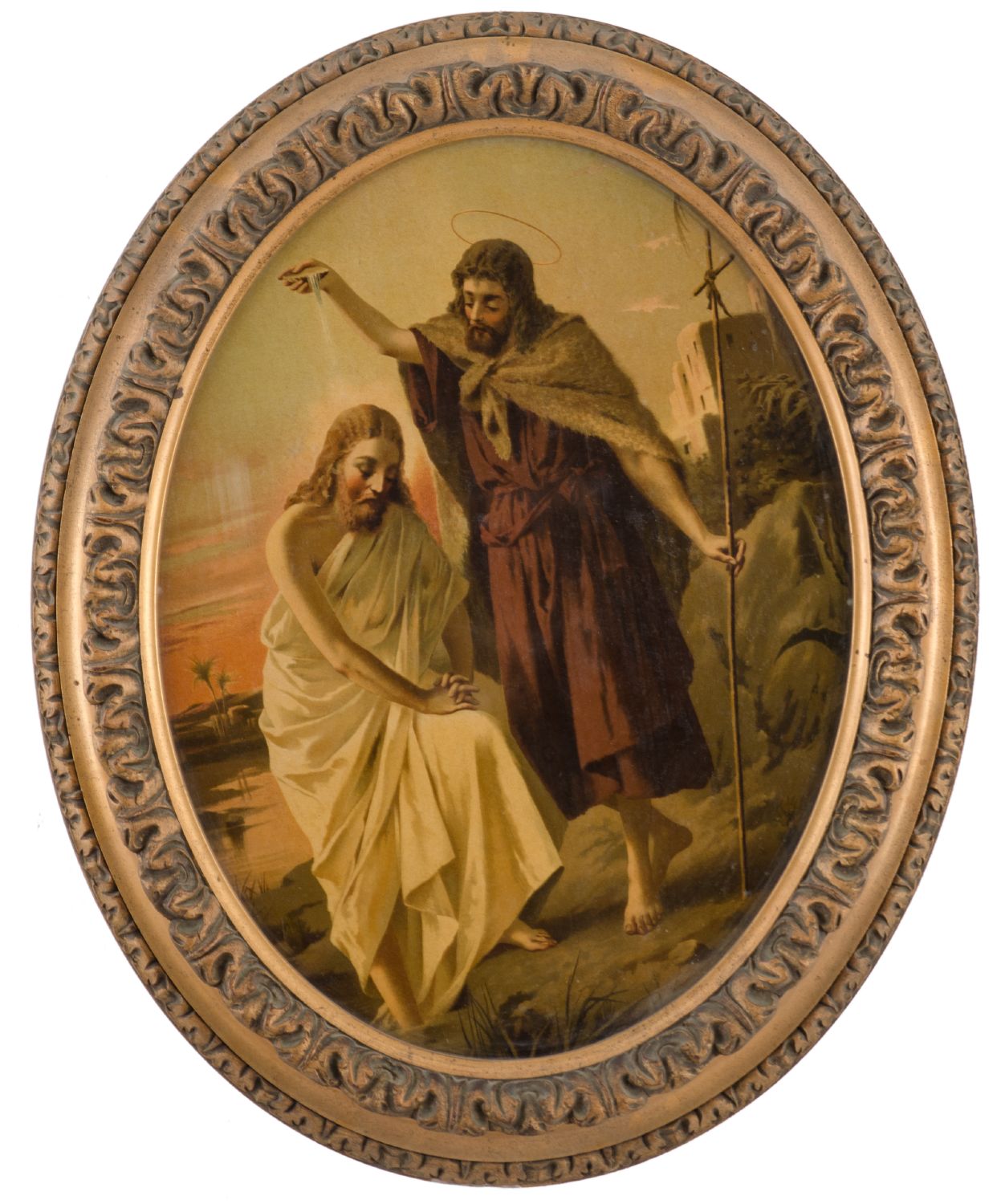 OLEOGRAFIA ovale "Battesimo di Cristo" entro cornice dorata coeva. XX secolo Misure: cm 51 x 39
