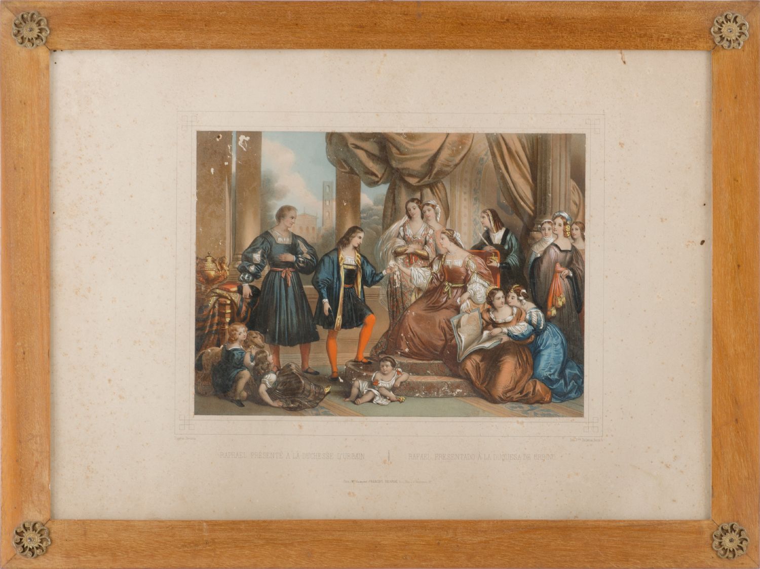 STAMPA ritoccata a mano raffigurante "Raffaello presentato alla Duchessa di Urbino" (usure). Francia XIX secolo Misure: cm 40 x 55