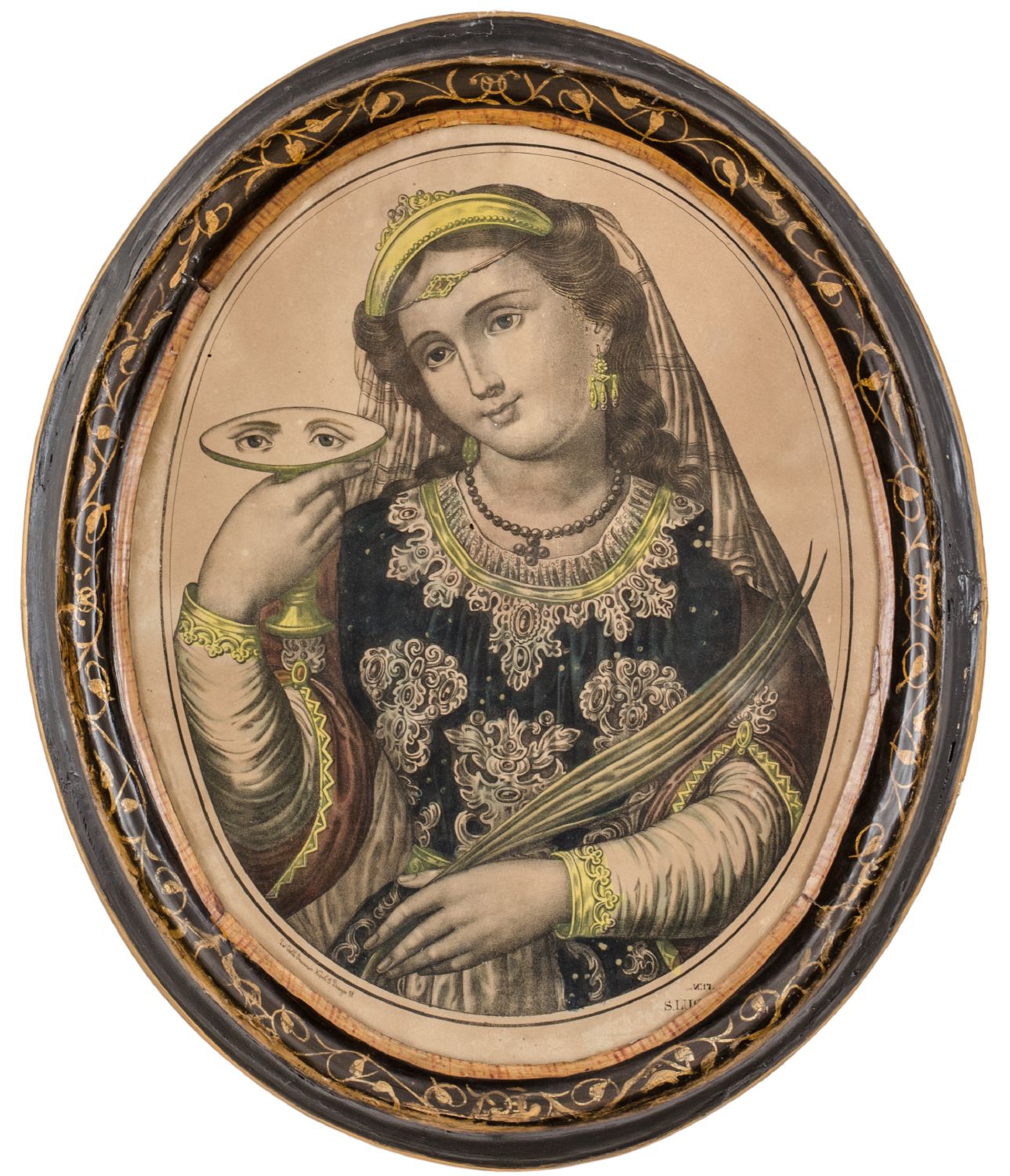 INCISIONE a colori raffigurante "Santa Lucia" entro cornice in legno laccato con disegni dorati. Sicilia meta' '800 Misure: cm 64 x 50