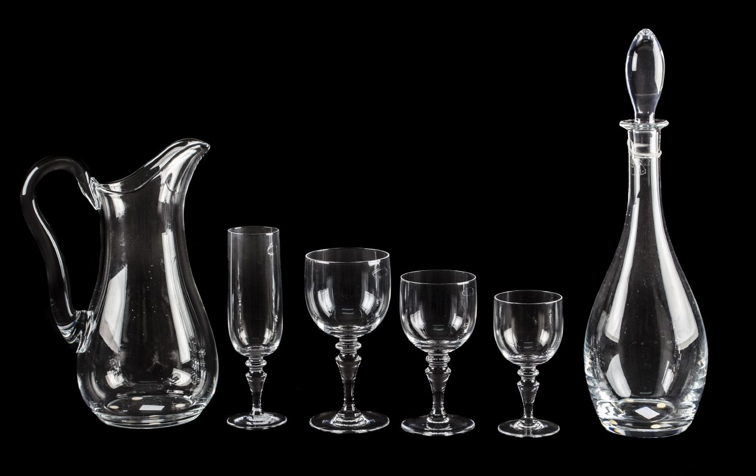 SERVIZIO BICCHIERI in cristallo di Sevres composto da BROCCA, BOTTIGLIA, 11 BICCHIERI per acqua, 12 BICCHIERI da vino, 11 FLUTEs e da 12 BICCHIERI da vino. XX secolo Misure: varie