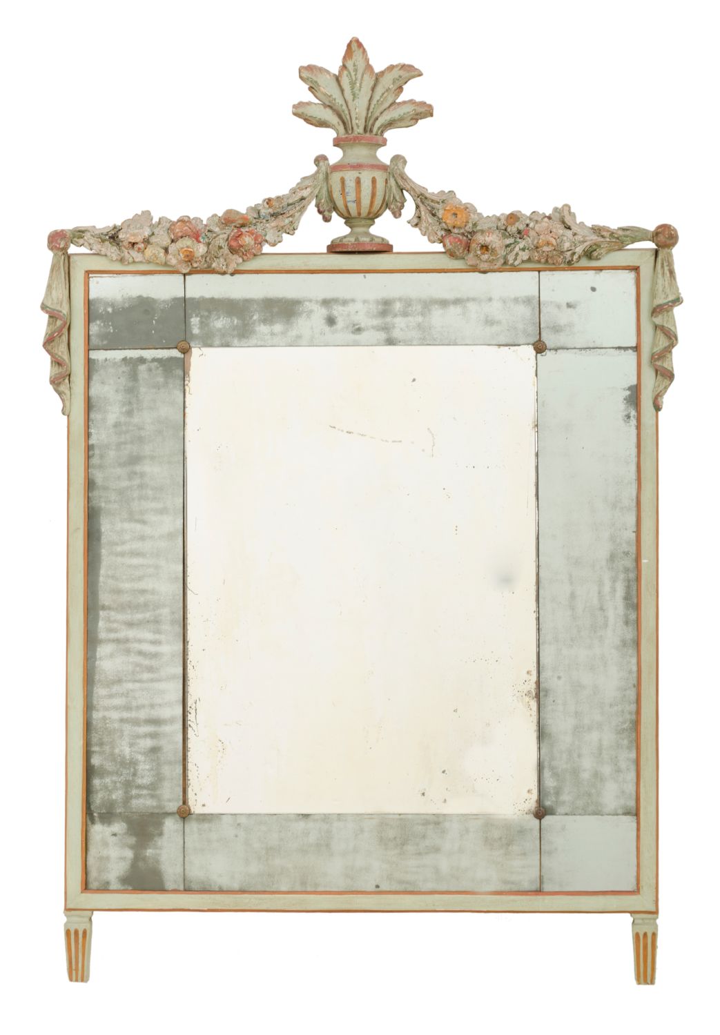 SPECCHIERA in legno laccato con cimasa scolpita raffigurante "composizione...