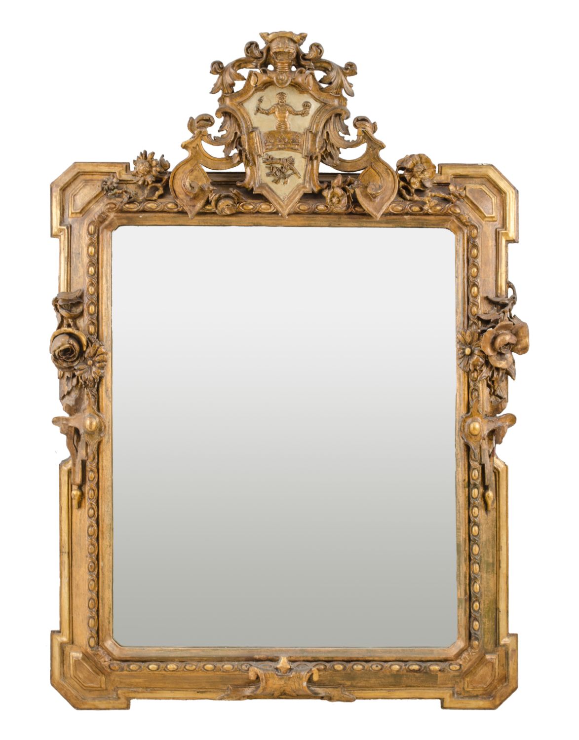 SPECCHIERA in legno intagliato e dorato con fregio raffigurante "stemma con blasone". Italia XVIII secolo Misure: cm 96 x 134