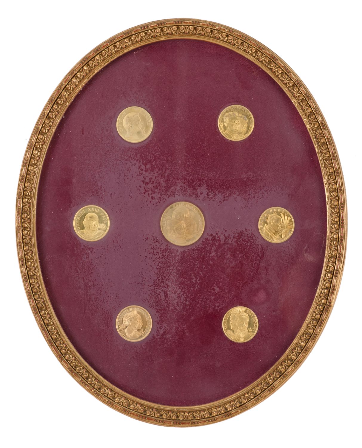 SETTE MONETE in metallo dorato incorniciate. Misure: cm 32 x 26