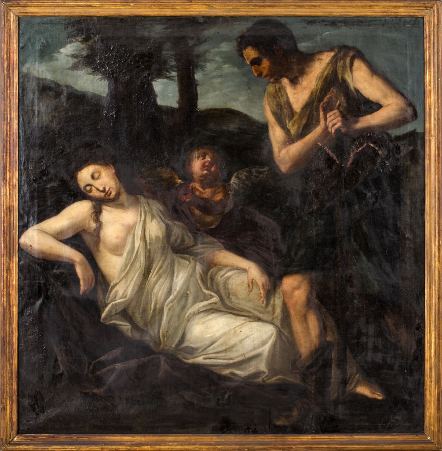 OLIO su tela "Agar con il figlio Ismaele". Sicilia fine '600 Misure: cm 133 x 130