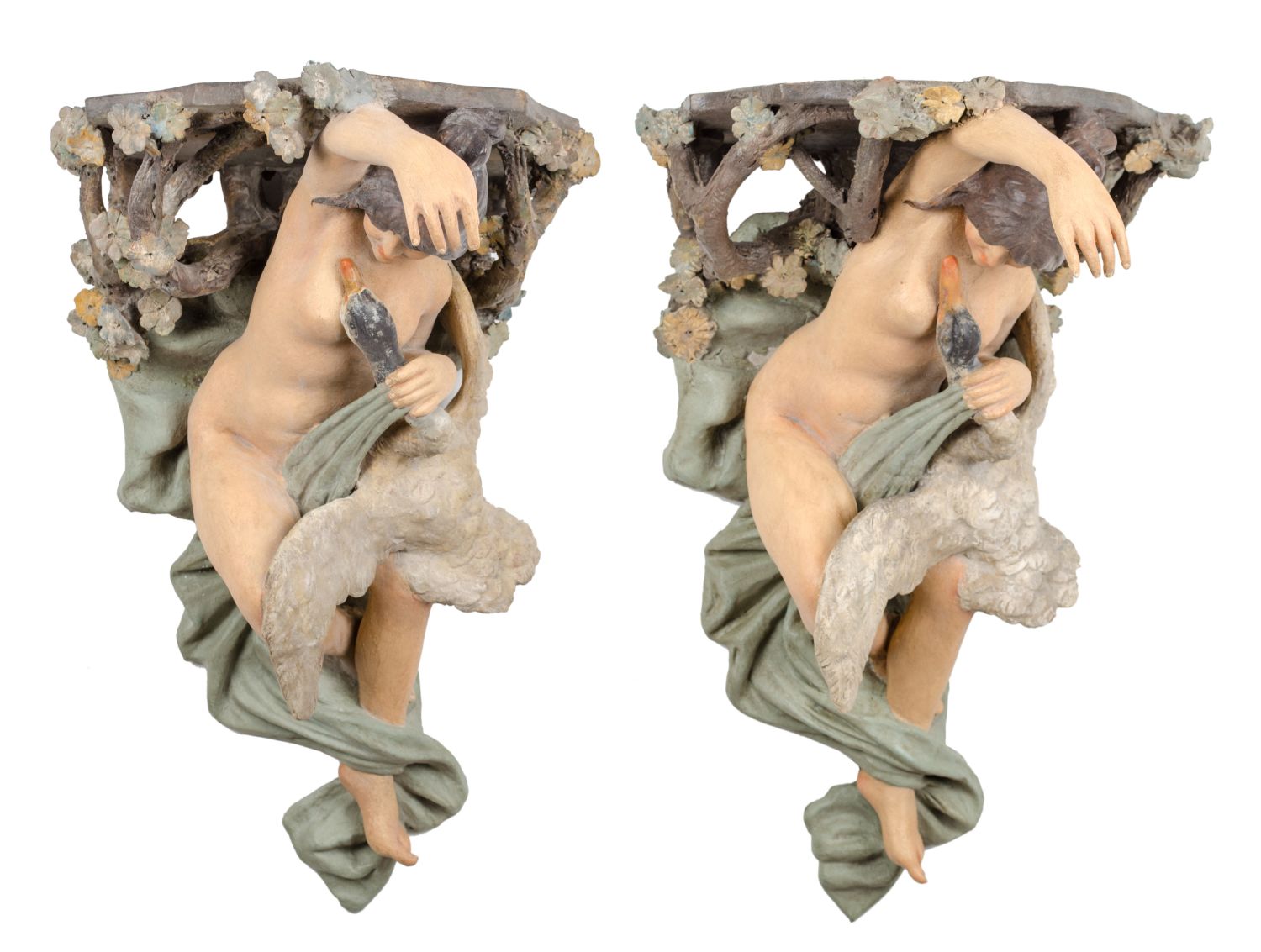 COPPIA MENSOLE in terracotta dipinta raffiguranti "nudi femminili con cigni"....