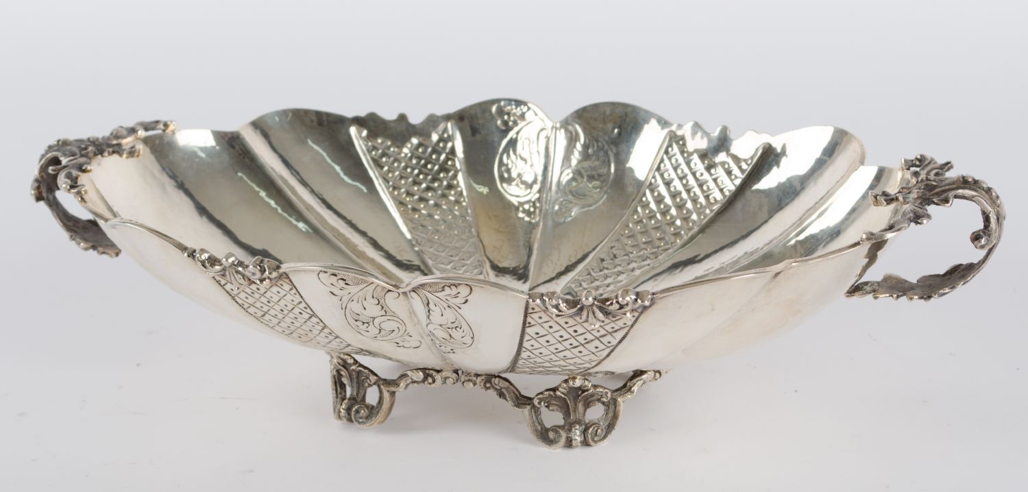 GIATTA in argento sbalzato a mano (g. 887). Italia XX secolo Misure: cm 40 x 20,5 x h 9,5