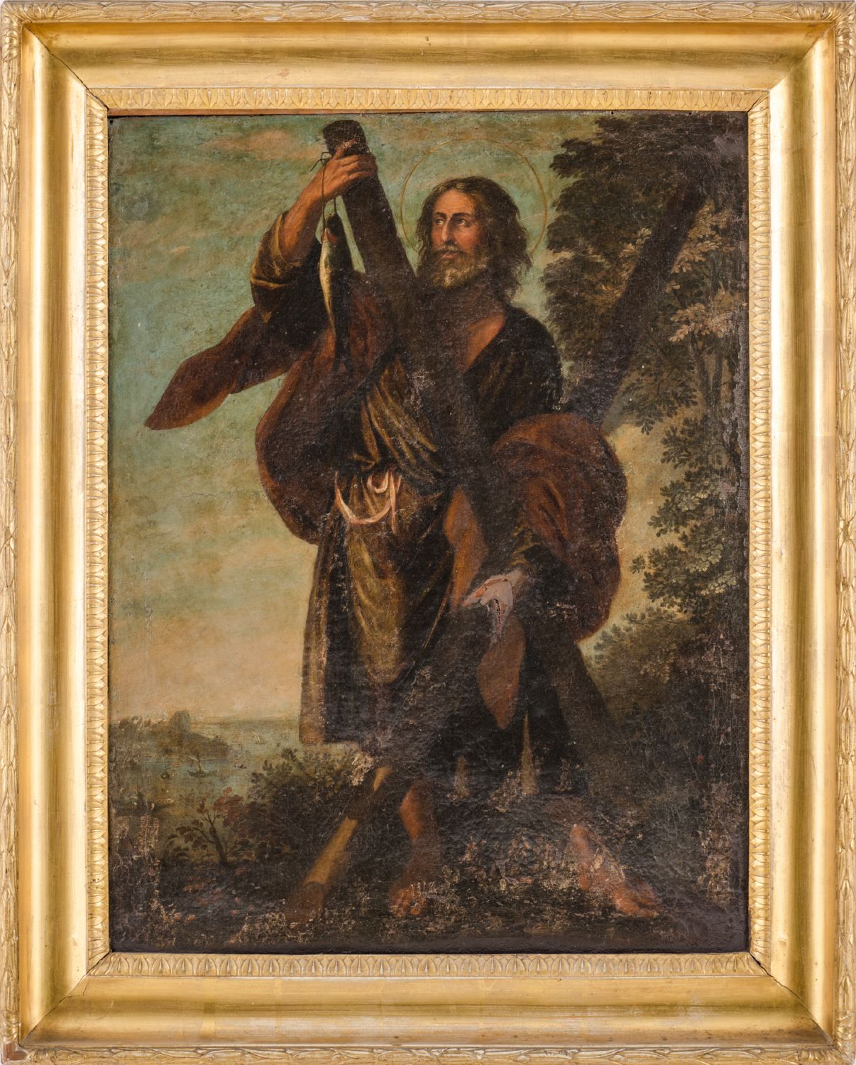 OLIO su tela "Sant'Andrea" entro cornice siciliana in legno dorato ad oro zecchino del XIX secolo. Italia XVIII secolo Misure: cm 62,5 x 48