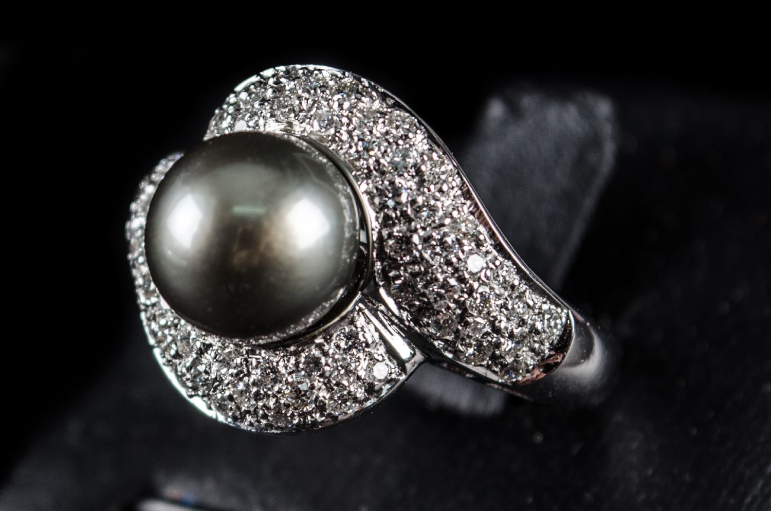 ANELLO in oro bianco 18 Kt. con perla Thaiti centrale (Kt. 15) e pave' di brillanti (Kt. 2) (g. 10.70).