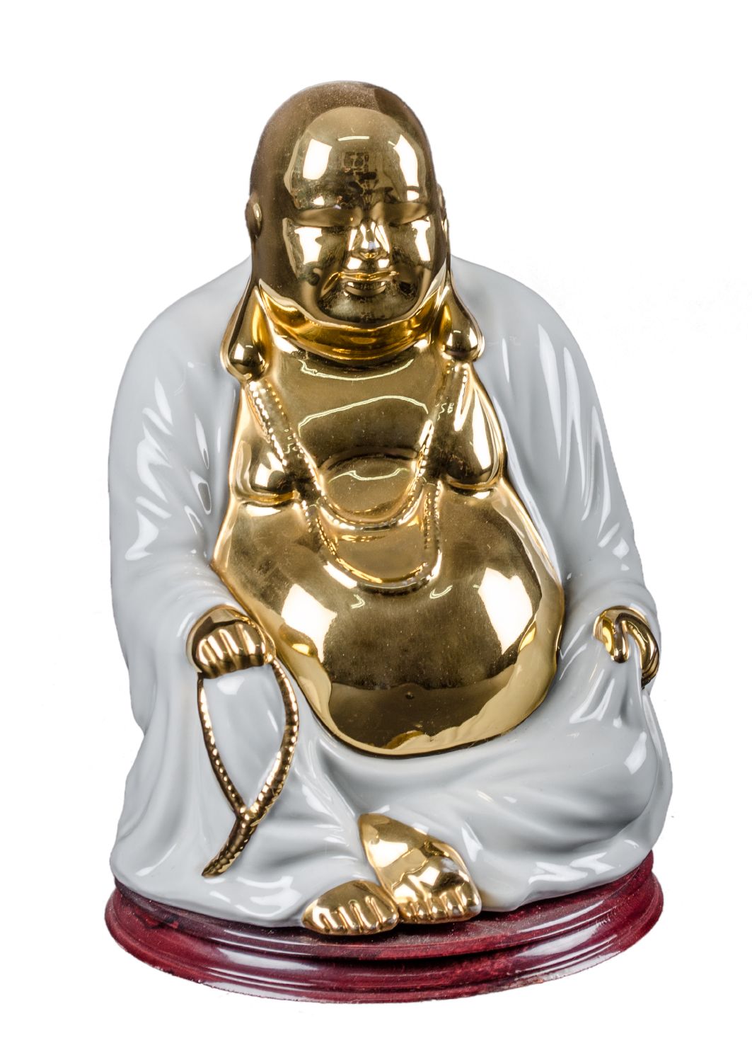 SCULTURA in porcellana raffigurante "Buddha" nei toni del bianco e oro. Cina...