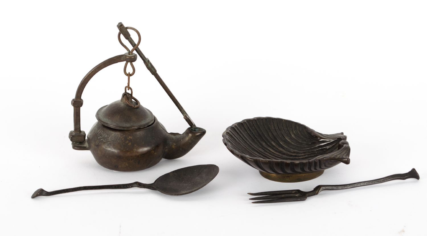 LOTTO composto da piccolo VERSATOIO, CONCHIGLIA e da FORCHETTA con CUCCHIAINO in bronzo brunito. Cina XIX secolo Misure: varie