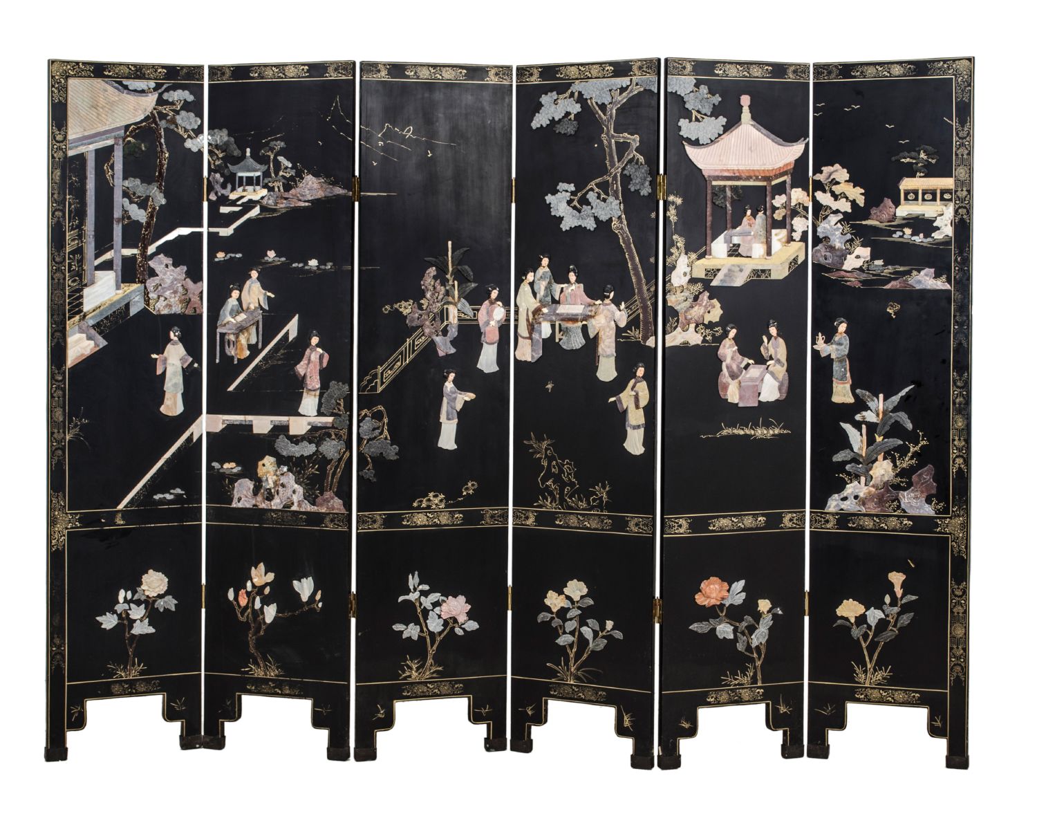 PARAVENTO in legno ebanizzato con applicazioni in pietre dure raffiguranti "scene di vita orientale". Cina XIX secolo Misure: cm 240 x 183