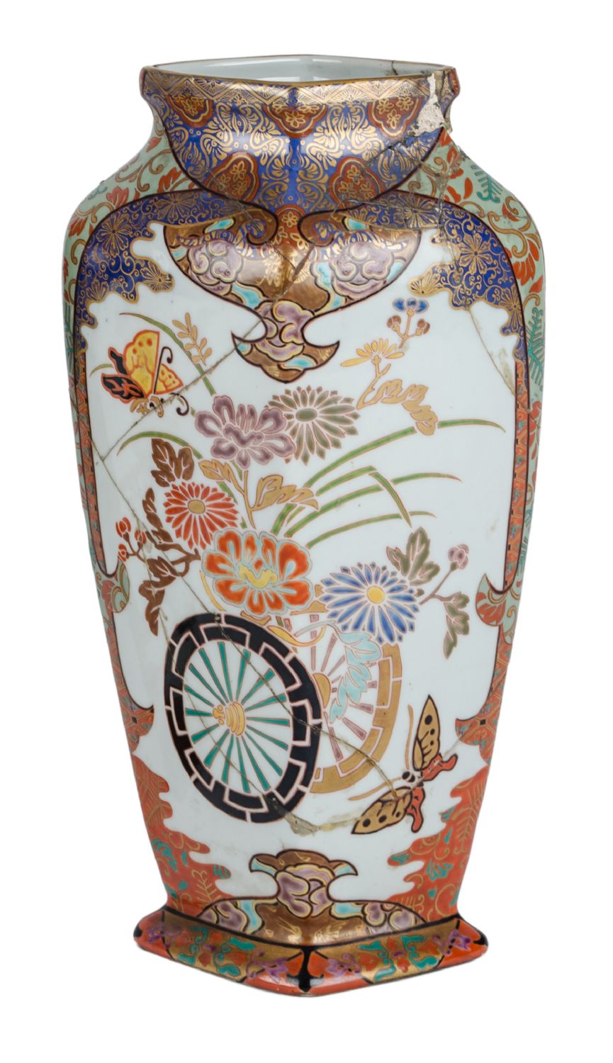 VASO in porcellana dipinta a motivo naturalistico (usure, rotture, mancanze e restauri). Giappone XIX secolo Misure: h cm 32