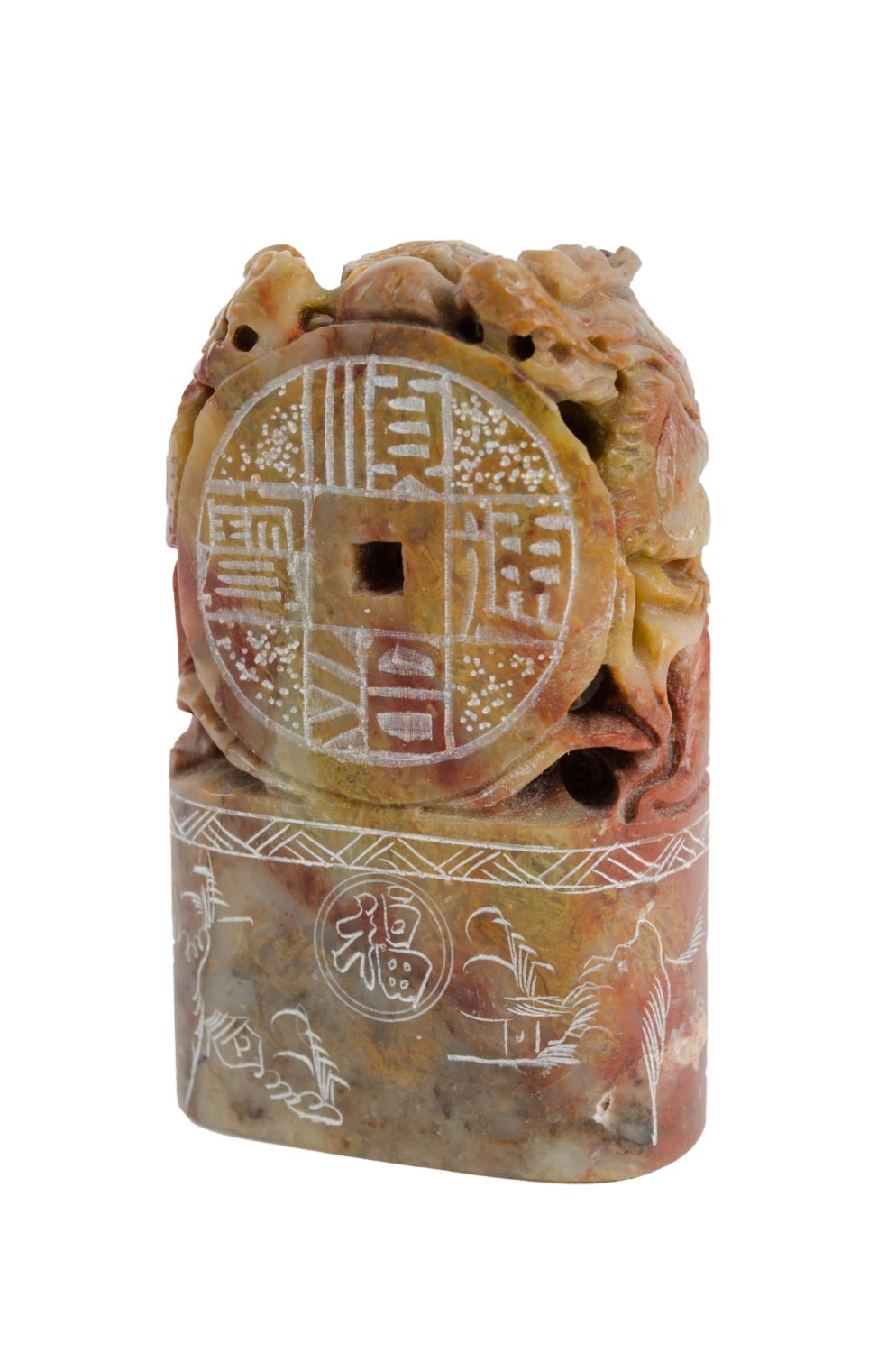 PICCOLA SCULTURA in marmo raffigurante "dragoni con scudo inciso". Cina XX secolo Misure: cm 5 x 3 x h 8