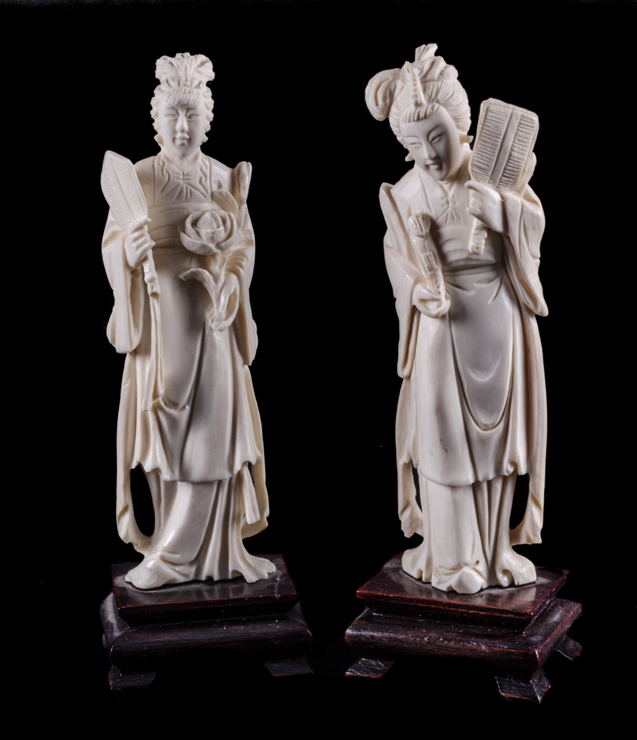 DUE SCULTURE in avorio raffiguranti "geishe", base in legno. Cina primi '900 Misure: h cm 13