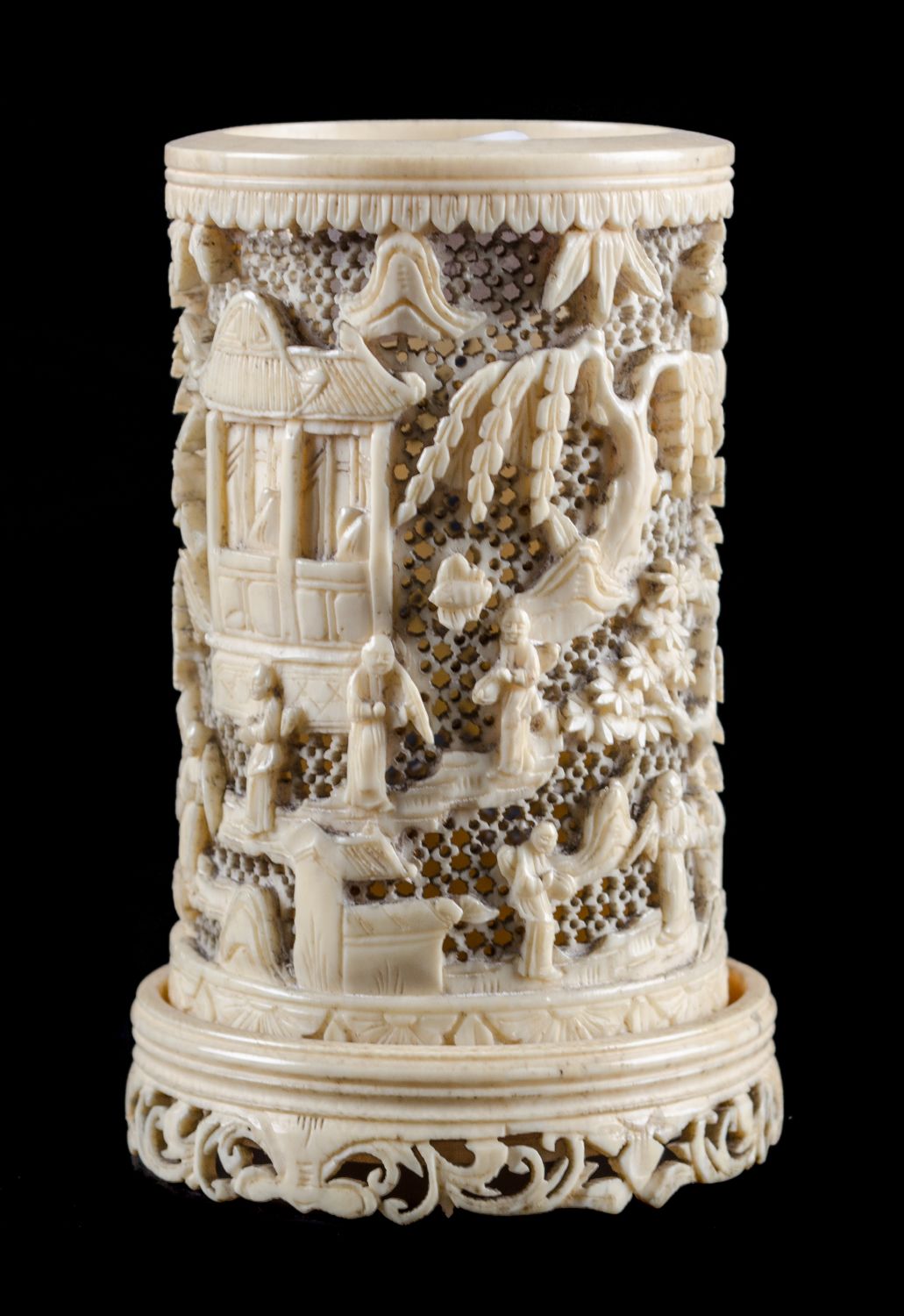 SCULTURA a torre in avorio traforato raffigurante "scena di vita orientale" (difetti). Cina XIX secolo Misure: diametro cm 6,5 x h 10