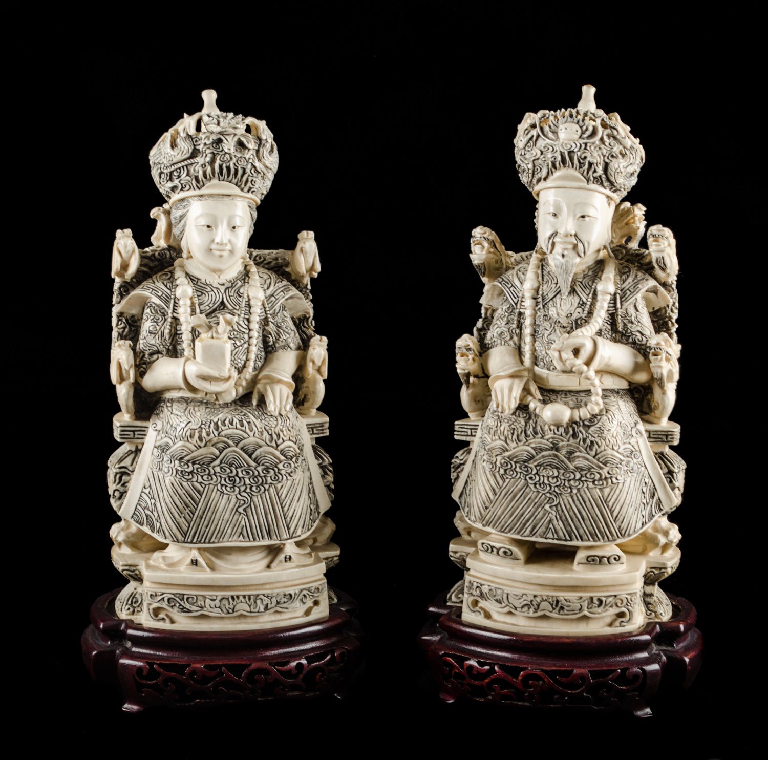 COPPIA SCULTURE in avorio raffiguranti "dignitari" con basi in legno. Cina XIX secolo Misure: h cm 27