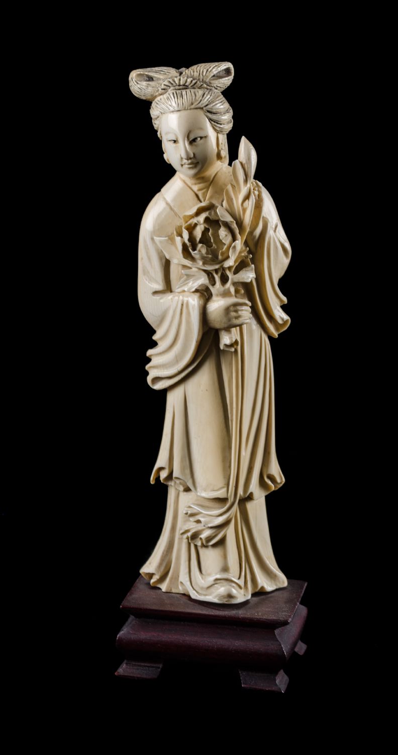 SCULTURA in avorio raffigurante "Geisha" con base in legno. Cina primi '900 Misure: h cm 18