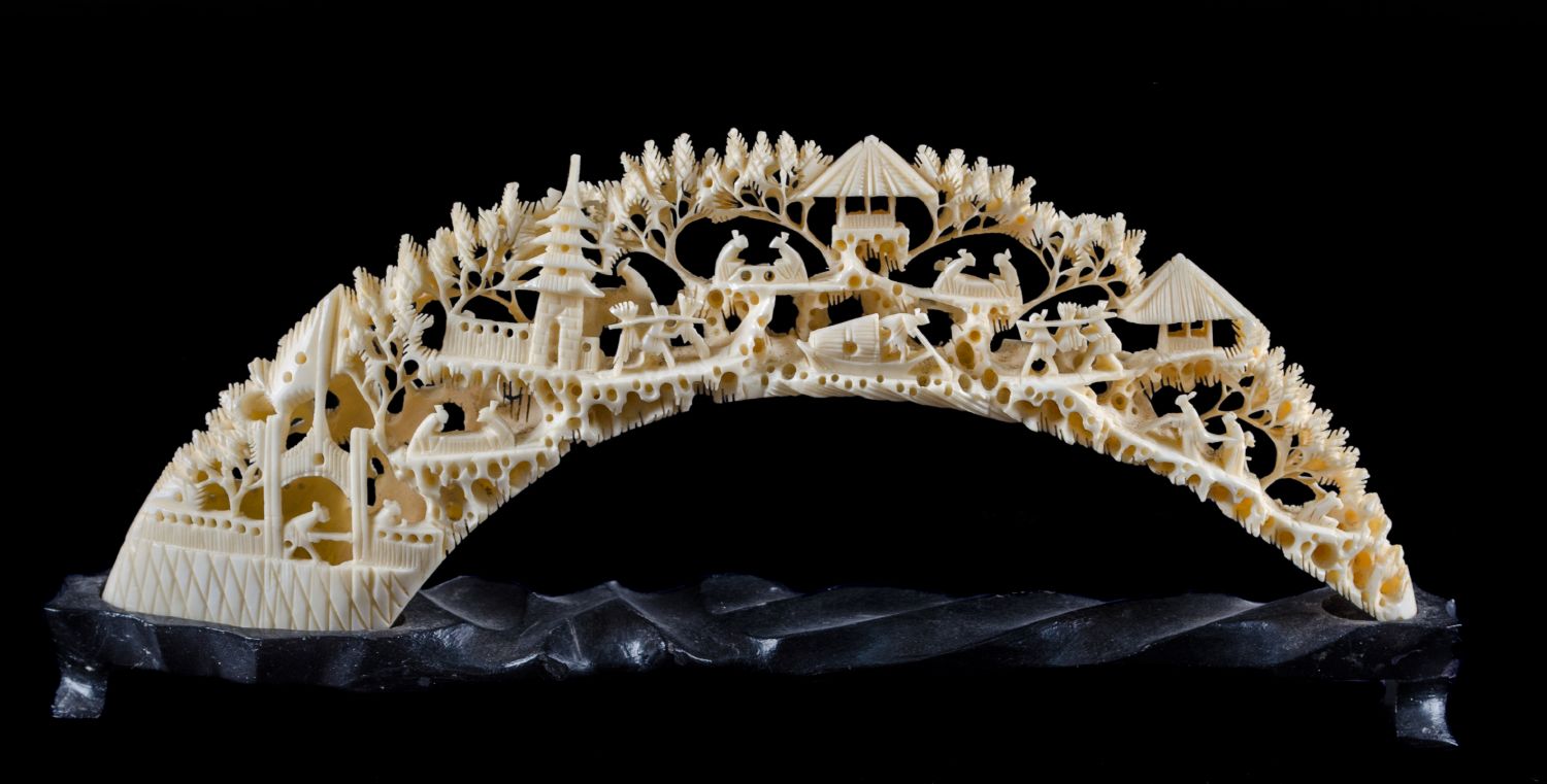 PICCOLA ZANNA in avorio intagliato raffigurante "scena di vita orientale". Cina fine '800 Misure: cm 23,5 x h 9