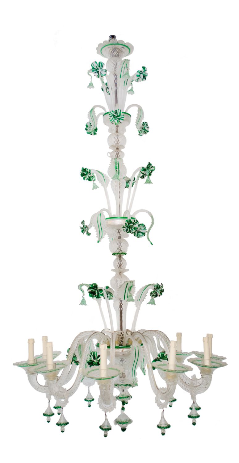 GRANDE LAMPADARIO a dieci luci in vetro di Murano nei toni del bianco e del verde. XX secolo Misure: h cm 190