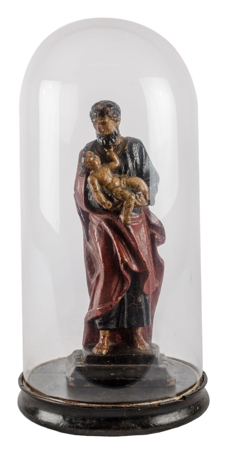 SCULTURA in legno policromo raffigurante "San Giuseppe con Bambino" entro campana in vetro. Sicilia XVIII secolo Misure: h cm 47