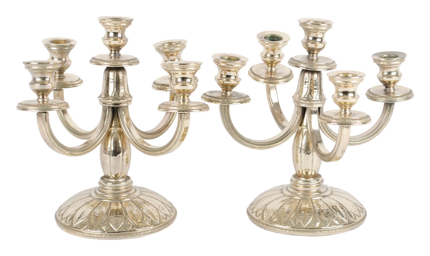 COPPIA CANDELABRI a cinque fiamme in metallo argentato. Primi '900 Misure: h cm 30